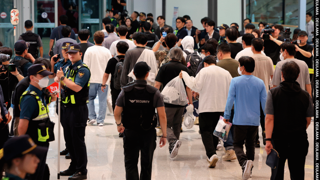 Trabalhadores sul-coreanos detidos em operação do ICE nos EUA relatam más condições, retornam por “partida voluntária” e recebem apoio do governo em Incheon